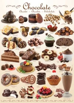 EuroGraphics Schokolade 1000-Teile Puzzle. Verpackungsabmessungen 35 x 25 x 6 cm. Abmessungen des zusammengebauten Puzzles 48 x 68 cm. Genießen Sie Schokokuchen, Rumkugeln, Cupcakes, und Schokokekse mit Ihren Augen beim Zusammenbauen dieses Puzzles. Speziell entwickelte Pappe mit wiederstandsfähiger Leinenstruktur für einen noch besseren Zusammenhalt der Teile.