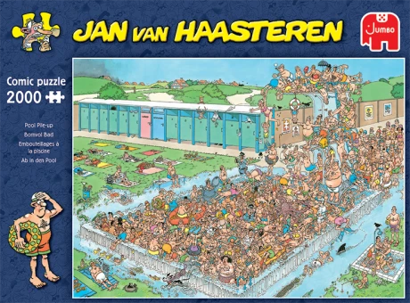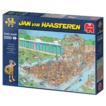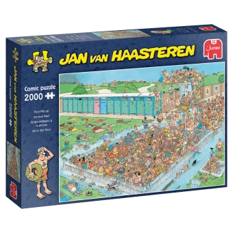 Seit Jahrzehnten gestaltet Jan van Haasteren äußerst detailreiche, bunte und vor allem humorvolle Illustrationen. Die meisten seiner Fans suchen sofort nach Jans Markenzeichen − der Haiflosse, die auf jedem Puzzle zu finden ist. Man kann aber auch nach anderen Lieblingselementen Ausschau halten − nach dem heiligen Nikolaus, dritten Zähnen oder Jans Selbstporträt, die auf fast allen seiner Bildern vorkommen.
