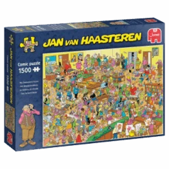Seit Jahrzehnten gestaltet Jan van Haasteren äußerst detailreiche, bunte und vor allem humorvolle Illustrationen. Die meisten seiner Fans suchen sofort nach Jans Markenzeichen − der Haiflosse, die auf jedem Puzzle zu finden ist. Man kann aber auch nach anderen Lieblingselementen Ausschau halten − nach dem heiligen Nikolaus, dritten Zähnen oder Jans Selbstporträt, die auf fast allen seiner Bildern vorkommen.