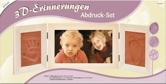 In diesem Set können 2 Abdrücke und 1 Panoramafoto oder eine Collage miteinander kombiniert werden. Die Abdrücke werden auf der ausgerollten lufttrocknenden Knetmasse erstellt und links und rechts im Rahmen platziert. Im Mittelteil wird das Foto oder die Collage hinzugefügt.