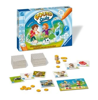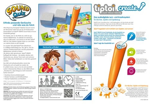 Im Sound-Quiz sind Fantasie und Assoziationsvermögen gefragt: Die Spieler erfinden abwechselnd kreative Geräusche, die zu einem Bild passen, das zunächst nur sie sehen können. Wie klingt eine Trompete? Welchen Sound macht ein Rennauto? Mit dem tiptoi Stift mit Aufnahmefunktion nehmen sie es spielerisch auf. Die Mitspieler raten, um welches Bild es sich gerade handelt. Wer richtig liegt, bekommt einen Punkt. Im zweiten Teil des Spiels geht es um Schnelligkeit und ein gutes Gedächtnis. Eine zufällige Aufnahme wird vom tiptoi Stift abgespielt und die Spieler versuchen schnellstmöglich das zugehörige Bild wiederzufinden. Es gewinnt, wer am meisten Punkte sammelt. Lustige Spielrunden, fantasievolle Geräusche und Spannung pur mit dem Sound-Quiz ist kreativer Spielspaß garantiert.