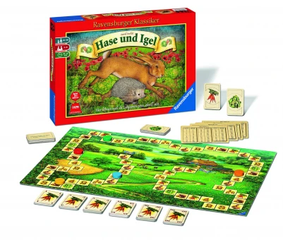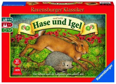 In diesem Ravensburger Klassiker Hase und Igel nähern sich die 2-6 Spieler durch überlegtes vorwärts und rückwärts Bewegen langsam, aber sicher der Ziellinie. Nur wer mit seinem Karotten- und Salatvorrat am geschicktesten umgeht, kann gewinnen. Mit reichlich Karotten und noch mehr Siegeswillen geht´s an den Start. Doch der Möhrenvorrat reicht nicht aus, um damit direkt ins Ziel zu kommen. Also müssen die Spieler sich immer wieder mal geschickt zurückfallen lassen, um neue Kraft zu tanken. Und auch der Salat muss unterwegs noch vertilgt werden.