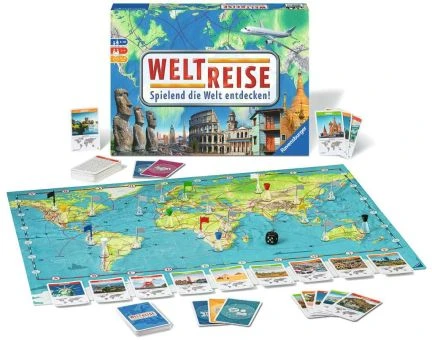 Im Familienspiel „Weltreise“ besuchen die Spieler die interessantesten Orte der Welt. Zufällig verteilte Städtekarten bestimmen jede Partie eine neue, für jeden Spieler unterschiedliche Reiseroute. Von Tokio über London nach New York – oder von Rio de Janeiro nach Kapstadt und Hongkong? Auf jeden Fall heißt es: clever planen. Die große Tour fordert Taktik und etwas Würfelglück! 173 lohnende Reiseziele warten auf die Spieler, darunter Pflichtreiseziele und freie Reiseziele, die zusätzliche Punkte bringen. Unterwegs ist es möglich, die Mitspieler mit Aktionskarten von ihrer Reiseroute abzubringen und zu sich einzuladen. Es ist auch möglich, seine eigene Route abkürzen, indem man einen anderen Spieler besucht oder ein ungünstig gelegenes Ziel einfach austauscht. Gewonnen hat die „Weltreise“, wer als Erster nach allen Reisezielen wieder am Ausgangsort angekommen ist und die meisten Punkte gesammelt hat. Und wer während des Spiels die Infotexte auf den Städtekarten liest, bereist nicht nur die Welt, sondern lernt auch jede Menge Wissenswertes über San Francisco, Montreal, Seoul und Co. Jede Partie nimmt die Spieler mit auf eine neue, spannende Weltreise, bei der es jede Menge zu entdecken gibt!