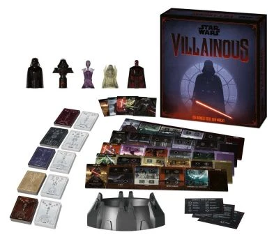 In Villainous übernehmen die Spieler die Rolle eines kultigen Star Wars™-Schurken. Sie wählen zwischen Darth Vader, Kylo Ren, General Grievous, Asajj Ventress oder Moff Gideon. Jeder hat dabei ein einzigartiges Ziel und Fähigkeiten, die auf seiner Geschichte und seinen Fähigkeiten basieren. Spieler können auch ihre Gegner aufmischen, indem sie sie gegen Jedi und Helden wie Luke Skywalker, Han Solo, Prinzessin Leia und viele mehr antreten lassen. Es gewinnt, wer sein Spielziel zuerst erreicht. Star Wars™ Villainous nutzt das Villainous-Spielsystem mit zusätzlichen Elementen, um die Spieler vollständig in das Star Wars™-Universum eintauchen zu lassen. Dabei können die Spieler unter anderem ikonische Schiffe wie TIE-Turbosternjäger einsetzen, um mit anderen Fahrzeugen, wie dem Millennium Falken ins Gefecht zu ziehen. Zudem können Bösewichte ihren Ehrgeiz nutzen, um die einzigartigen Fähigkeiten ihres Schurken zu stärken.In einem Zug bewegt der aktive Spieler seine Spielfigur an einen anderen Ort auf seinem Spielplan, führt eine oder mehrere der auf diesem Feld sichtbaren Aktionen aus. Karten sind Handlanger, Gegenstände, Ereignisse und andere Dinge. Spieler müssen ihre Karten einsetzen, um ihre Siegbedingung zu erfüllen.