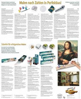 Die Packung für alle kreativen Malen-nach-Zahlen Künstler enthält einen stabilen, leinenstrukturierten Malkarton in der Größe 40 x 50 cm, und exakte Konturenzeichnungen mit gut lesbaren Zahlen. Die Acrylfarben sind auf Wasserbasis malfertig gemischt. Es ist daher kein Farbmischen erforderlich. Auch Zahlenaufkleber, ein Synthetikhaarpinsel mit Pflegeanleitung und ein Kontrollblatt zum Auffinden bereits übermalter Flächen sind beigefügt. Die ausführliche Malanleitung gibt viele Tipps für erfolgreiches Malen.