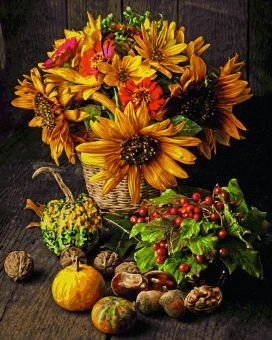 Strahlend gelbe Gazanien leuchten, die orange-roten Zinnien und die glänzend roten Beeren des Schneeballs bringen die angenehme ruhige Wärme des Herbstes in diese Bildkomposition. Abgerundet wird das Stillleben durch die Früchte des Herbstes wie Kürbis, Kastanie, Eichel und Walnuss in gelblich braunen Farbnuancen. Ein stimmungsreiches Bild, das die wundervolle Seite des Herbstes ins Zuhause bringt.