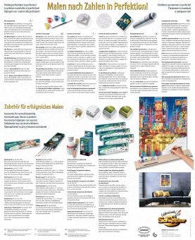 Stabiler Malkarton mit Leinenstruktur 40 x 50 cm. Exakte Konturenzeichnungen mit gut lesbaren Zahlen. Acrylfarben auf Wasserbasis. Kein Farbmischen erforderlich. Feiner Malpinsel. Kontrollblatt und ausführliche Anleitung für erfolgreiches Malen.