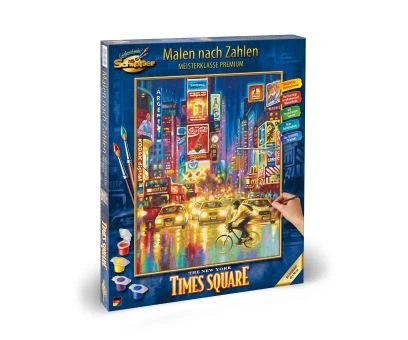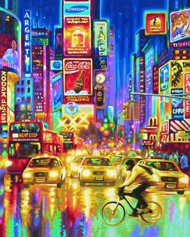 Der Times Square ist Zentrum des New Yorker Theaterdistrikts. Hier ist das pulsierende Herz der Metropole, das vor allem nachts durch die überwältigende Farbenpracht der Leuchtreklamen seinen ganz besonderen Charme entfaltet. Das Motiv besticht durch Vielfalt und Kraft der Farben, versucht in moderner Formensprache die Bewegung des Augenblicks festzuhalten, um die faszinierende Großstadtimpression ins rechte Licht zu setzen.