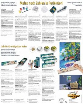 Stabiler Malkarton mit Leinenstruktur 40 x 50 cm. Exakte Konturenzeichnungen mit gut lesbaren Zahlen. Acrylfarben auf Wasserbasis. Feiner Malpinsel. Kontrollblatt und ausführliche Anleitung für erfolgreiches Malen.