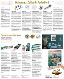Stabiler Malkarton mit Leinenstruktur Stabile 40 x 50 cm. Exakte Konturenzeichnungen mit gut lesbaren Zahlen. Acrylfarben auf Wasserbasis. Kein Farbmischen erforderlich. Feiner Malpinsel. Kontrollblatt und ausführliche Anleitungen für erfolgreiches Malen.