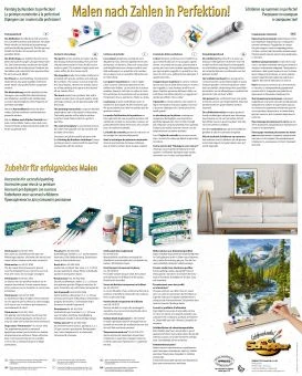Stabiler Malkarton mit Leinenstruktur Stabile 40 x 50 cm. Exakte Konturenzeichnungen mit gut lesbaren Zahlen. Acrylfarben auf Wasserbasis. Kein Farbmischen erforderlich. Feiner Malpinsel. Kontrollblatt und ausführliche Anleitungen für erfolgreiches Malen.