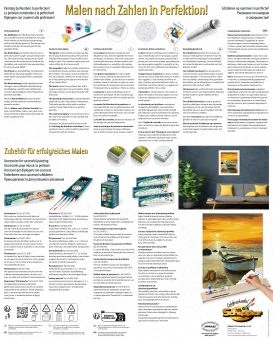 Stabiler Malkarton mit Leinenstruktur Stabile 40 x 50 cm. Exakte Konturenzeichnungen mit gut lesbaren Zahlen. Acrylfarben auf Wasserbasis. Kein Farbmischen erforderlich. Feiner Malpinsel. Kontrollblatt und ausführliche Anleitungen für erfolgreiches Malen.