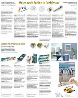 Stabiler Malkarton mit Leinenstruktur Stabile 40 x 50 cm. Exakte Konturenzeichnungen mit gut lesbaren Zahlen. Acrylfarben auf Wasserbasis. Kein Farbmischen erforderlich. Feiner Malpinsel. Kontrollblatt und ausführliche Anleitungen für erfolgreiches Malen.