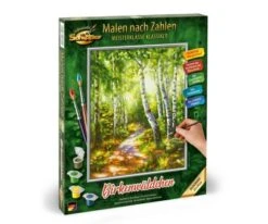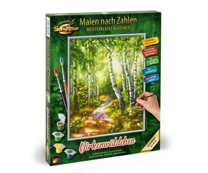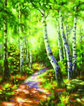 Das sonnendurchflutete Birkenwäldchen ist ein besonderer Anreiz zum Malen. Die unterschiedlichen Grüntöne der Blätter und die weißgrauen, teils silbrig glänzenden Stämme der Birken wecken die Inspiration jedes Hobbymalers, stellen ihn zugleich aber auch vor eine besondere Herausforderung. Die sommerliche Stimmung des Bildes wird durch das Schattenspiel der Bäume auf dem Waldweg und der angrenzenden Wildblumenwiese besonders hervorgehoben. Das fertige Bild lädt zum Waldspaziergang ein und zieht den Betrachter fast zwangsläufig in seinen Bann.