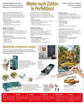 Stabiler Malkarton mit Leinenstruktur 24 x 30 cm. Exakte Konturenzeichnungen mit gut lesbaren Zahlen. Acrylfarben auf Wasserbasis. Feiner Malpinsel. Kontrollblatt und ausführliche Anleitung für erfolgreiches Malen.
