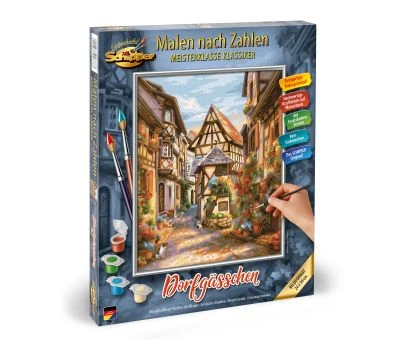 Die Fachwerkhäuser mit Blumenschmuck entlang einer schmalen verwinkelten Gasse strahlen Ruhe und Geborgenheit aus. Die warmen Farbtöne unterstreichen die beschauliche sommerliche Idylle, die beim Betrachten eine positive Stimmung entstehen lässt und zum Träumen anregt. Das Motiv regt den Hobbymaler zu einer inspirierenden künstlerischen Auseinandersetzung mit dem besonderen Charme und Charakter eines Dorfes an, in dem die Zeit still zu stehen scheint.