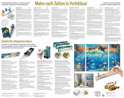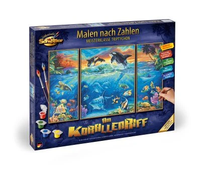Ein tropisches Korallenriff ist atemberaubende Schönheit unter Wasser. Es ermöglicht maritimes Leben mit fließenden Grenzen zwischen Pflanze und Tier, die Wiege des Lebens überhaupt. Das Motiv „Am Korallenriff“ zeigt einen lebhaften Ausschnitt der farbenprächtigen Unterwasserwelt in vielfach leuchtenden Blautönen. Erstmals sind die drei Malvorlagen für mit einer fühl- und sichtbaren Leinenstruktur versehen. Sie bewirken nicht nur eine wesentlich verbesserte Optik des fertigen Gemäldes, sondern unterstreichen auch den malerischen Charakter des Triptychons.