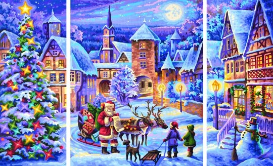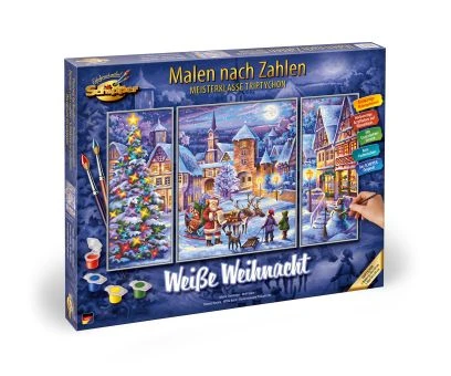 Friedlich ruhen die Häuser der romantischen Ortschaft unter ihren verschneiten Dächern. In den hell erleuchteten Stuben herrscht freudige Erwartung auf den Weihnachtsmann. Nur die beiden Kinder, die gerade vom Schlittenfahren kommen, haben ihn schon entdeckt und hoffen, dass er ihre Geschenke auf seiner Liste findet. Mit diesem Triptychon-Motiv „Weiße Weihnacht“ holt sich der Hobbymaler die friedliche Stimmung des Heiligen Abends mit seiner weißen Pracht ins weihnachtlich geschmückte Wohnzimmer.