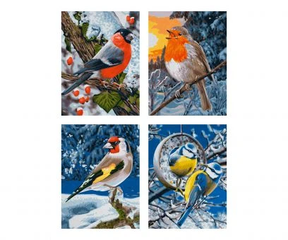“Wintervögel” – Die Fütterung unserer Wintervögel hat eine lange Tradition, weil die Tiere aus nächster Nähe beobachtet werden können. Beim Malen der Bilder kann der Hobbymaler den “Dompfaff”, das “Rotkehlchen”, den “Stieglitz” und die “Blaumeisen” nicht nur malen, sondern auch das farbenprächtige Gefieder der kleinen Freunde deutlich kennenlernen.