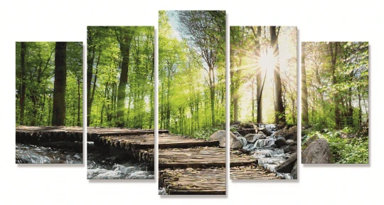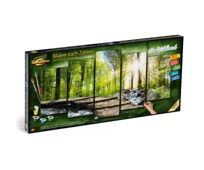 Die Größe des Bildes, aber auch die Schönheit der Szenerie beindruckt den Betrachter des 5-teiligen Polyptychons „Am Wildbach“. Gezeigt wird eine die Seele berührende Landschaft in den Farben eines Sommertages. Die Sonne blinzelt durch die Bäume und scheint auf den Holzsteg, der gleichzeitig alle 5 Bilder harmonisch miteinander verbindet. Selbst das Rauschen des Wildbachs wird hörbar, wenn sich der Hobbymaler an die Arbeit macht und ein Bild zaubert, das immer wieder aufs Neue eine erholsame und entspannte Stimmung ins Wohnzimmer bringt.