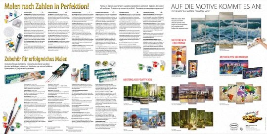 5 stabile Malkartons: 2 Vorlagen 263 x 476 mm, 2 Vorlagen 263 x 598 mm, 1 Vorlage 263 x 720 mm mit Leinenstruktur. Exakte Konturenzeichnungen mit gut lesbaren Zahlen. Acrylfarben auf Wasserbasis. Kein Farbmischen erforderlich. Feiner Malpinsel. Kontrollblatt und ausführliche Anleitung für erfolgreiches Malen.