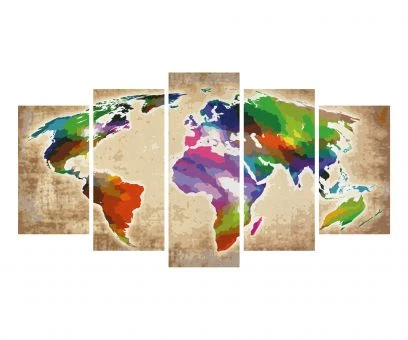 Die Weltkarte als farbenprächtiges abstraktes Kunstwerk. Als Hintergrund eine antike Weltkarte auf fleckigem Pergament. Die Satellitenaufnahme der Erdoberfläche wurde losgelöst von geographischen Gegebenheiten sowie Staaten- und Landesgrenzen farblich und gestalterisch verfremdet. Herausgekommen ist eine berauschende Mischung aus einer herrlich bunten Welt, die sich frech und lebensbejahend auf traditionellem Background präsentiert. Ein dekorativer Wandschmuck, der sich an keine realen Grenzen hält, und gerade deshalb einen Aufbruch in eine „Colorful World“ repräsentiert.