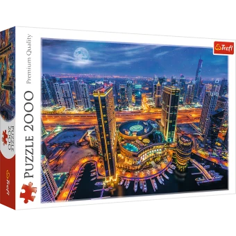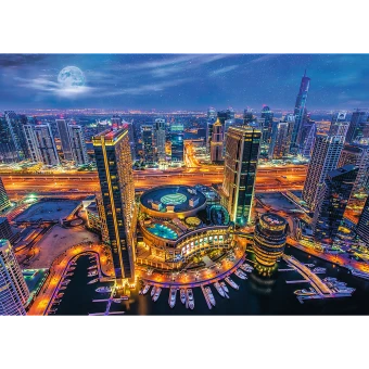 Puzzle 2000 Teile mit einem herrlichen Blick auf das beleuchtete Dubai nach Einbruch der Dunkelheit.