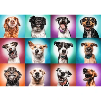 Ein Puzzle aus 2000 Elementen, die Funny Dog Portraits darstellen. Nach dem Verlegen wird ein Bild mit Abmessungen von 96,1×68,2 cm erstellt.