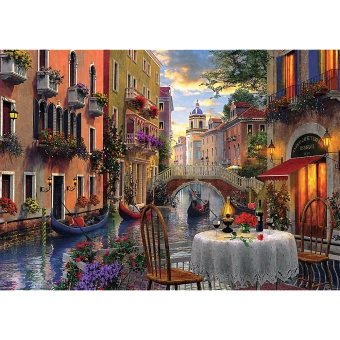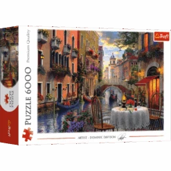 Ein 6000-teiliges Puzzle, mit einem Gemälde, das ein Restaurant am venezianischen Kanal darstellt. Nach dem Verlegen wird ein Bild mit Maßen von 136×96 cm erstellt. Das Produkt besteht aus hochwertigen Materialien unter Verwendung eines speziellen kalandrierten lichtreflektierenden Papiers, das das Verlegen erleichtert.